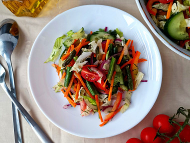 Стручковую фасоль, как и в рецепте, обжарила вместе с чесноком, это придаёт ей прекрасный аромат. Салат использовала айсберг и пекинскую капусту. Овощи порезала, добавила к ним уже остывшую фасоль, немного оливкового масла и сок лимона. Перед подачей отправила салат в холодильник примерно на час. За это время овощи идеально пропитались заправкой, соком и маслом. Вкус стал очень гармоничным и насыщенным.