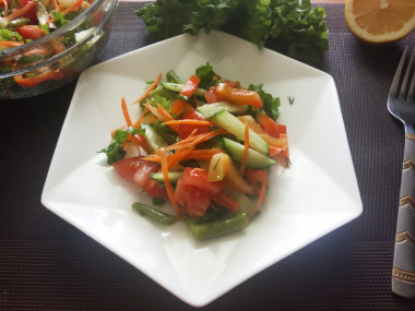 Захотелось приготовить овощной салат из огурцов с растительным маслом. Помидоры черри пришлось заменить на обычный помидор, красного лука не было, репчатый добавлять не стала, в сыром виде он у меня слишком резкий, решила просто добавить зелёный лук, фасоль по совету автора тоже обжарила с чесноком на растительном масле, его взяла с таким расчётом, чтобы не пришлось ещё добавлять в салат сырое масло. Все овощи нарезала, перемешала, добавила зелень ( укроп и зелёный лук), смесь перцев, лимонный сок. Салатик- замечательный, сочный, ароматный, очень вкусный. Спасибо за рецепт, Жемчужинка!