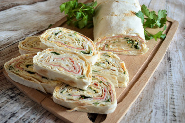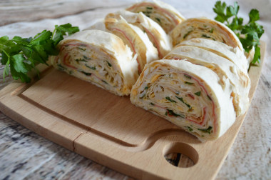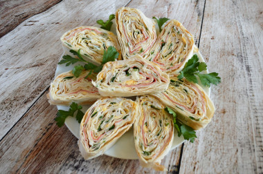 Затем нарежьте рулет из плавленного сыра и подавайте. Приятного аппетита.