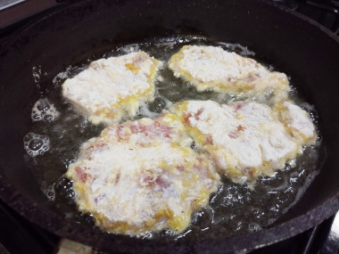 Затем обваляйте со всех сторон в муке. Лишнюю муку стряхните, чтобы она не подгорела на сковороде. При желании можете еще раз обмакнуть отбивные во взбитое яйцо. Я делала и так, и так и могу сказать, что если обмакивать отбивные в яйцо дважды, они получаются вкуснее.