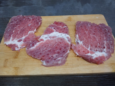 Кусок свинины промойте, обсушите бумажными полотенцами. Затем нарежьте тонкими ломтиками не более 1 см толщиной. У меня уже были нарезанные ломтики от окорока. Всего получается 4-5 ломтиков. Ломтики свинины накройте пищевой пленкой или пакетом и отбейте молоточком, стараясь сохранить целостность мяса. Совет: если нарезать ломтиками слегка подмороженный кусок мяса, то нарезка получится ровнее.