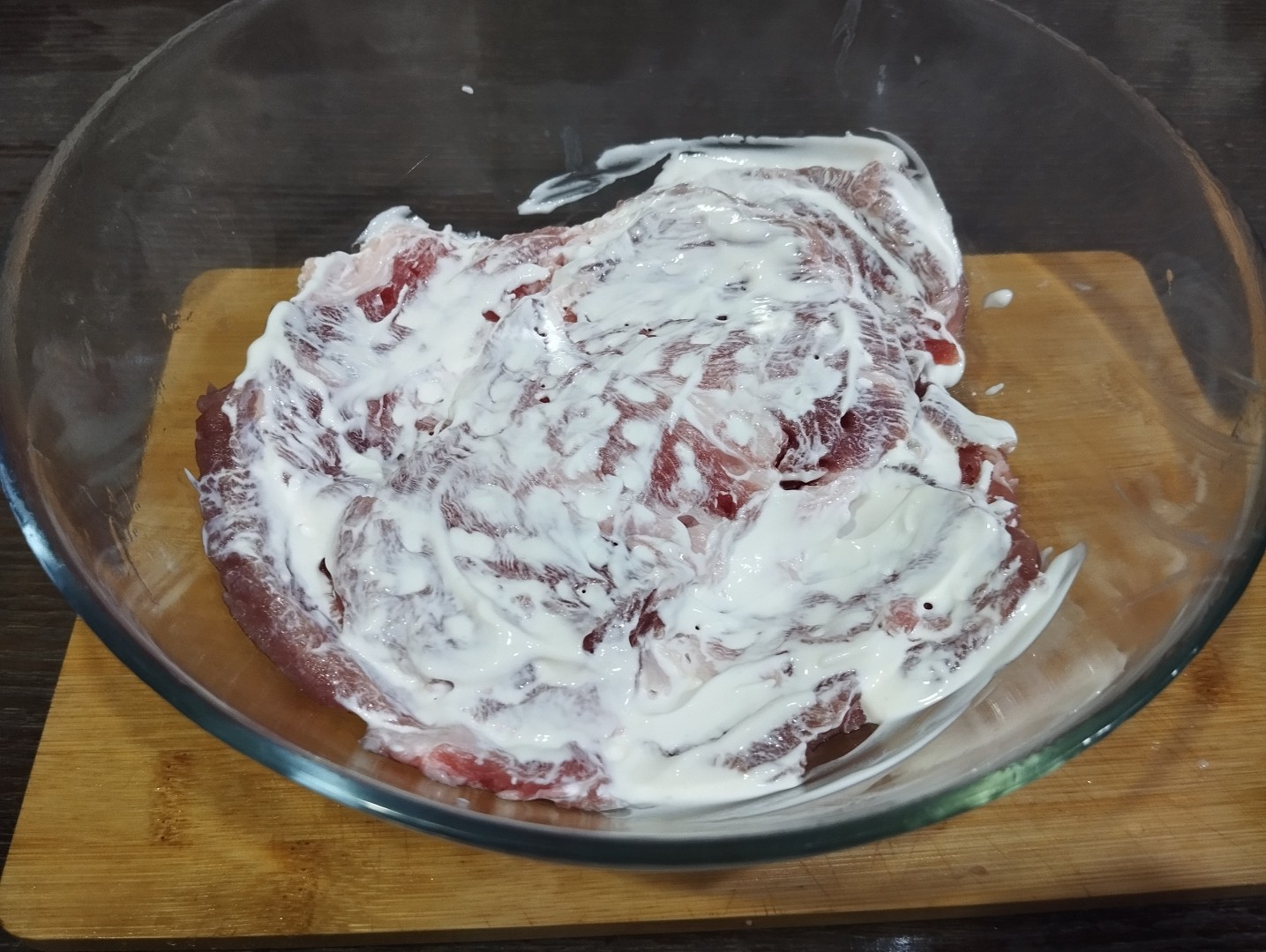 Затем залейте свинину сметаной, чтобы ломтики были покрыты ею со всех сторон и оставьте мариноваться при комнатной температуре 1 час, а если есть возможность еще подольше, то в холодильнике. Вообще чем дольше будет мариноваться мясо, тем сочнее оно в итоге получится.