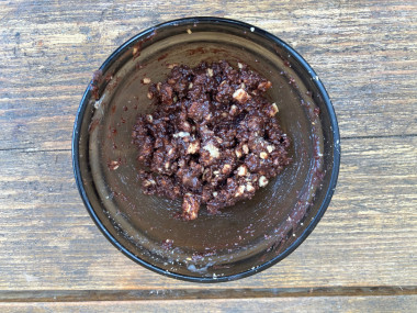 Заливаем песочную крошку в миске кремом, тщательно перемешиваем, чтобы вся крошка была покрыта кремом, не осталась сухой.