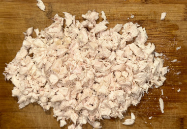 Подготовьте необходимые продукты. Можно взять любые части индейки (филе, голени). Индейку отварите в подсоленной воде до готовности. Опускайте индейку именно в кипящую воду, чтобы весь вкус и сочность остались в мясе, а не перешли в бульон. Готовую индейку остудите, отделите от костей. Нарежьте индейку мелкими кусочками.Шаг 2. Как подготовить яйца, грецкие орехи и сыр для салата?