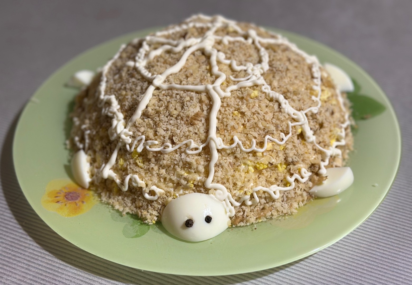 Форма черепашки была выбрана не случайно – она символизирует долголетие и мудрость, что делает салат желанным гостем на днях рождения.