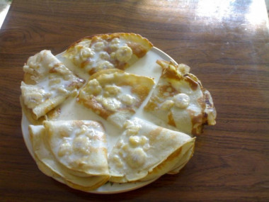 Сегодня утром сделала банановые блины на молоке по этому рецепту. Подавала их со сметаной.