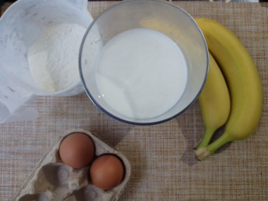 Как сделать банановые блины на молоке на сковороде? Подготовьте продукты. Бананы возьмите по возможности спелые, мягкие — они лучше разомнутся и ароматизируют блины. Молоко подойдет любой жирности. Муку предварительно просейте. Ее количество указано примерное, может уйти как больше, так и меньше, будете смотреть по тесту. О свойствах муки читайте в статье под шагами.