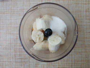 Для упрощения процесса приготовим тесто в стационарном блендере (если у вас нет блендера, то готовьте тесто как обычное блинное, а банан разомните вилкой). Поломайте в чашу очищенные от кожуры бананы. Вбейте яйца. Всыпьте сахар и соль. Их количество можете регулировать по своему вкусу. Если бананы очень сладкие, смело уменьшайте сахар. Взбейте все продукты до однородности.