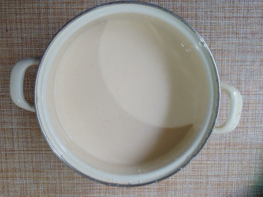 Взбейте тесто до полной однородности. Оно получится жидким, как на обычные блины. Густоту теста регулируйте мукой, в чересчур жидкое всыпьте еще. Снимите чашу с основания и влейте в тесто растительное масло без запаха. Перемешайте ложкой. Оставьте тесто постоять 10-15 минут — за это время мука полностью разойдется в молоке, в ней разовьется клейковина, и блины не буду рваться при переворачивании.
