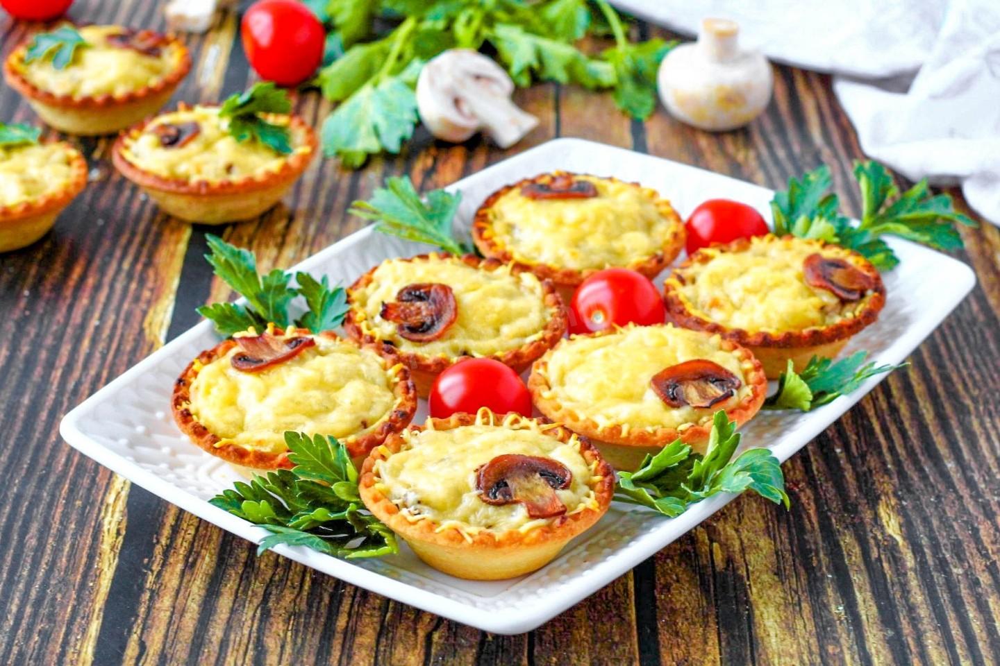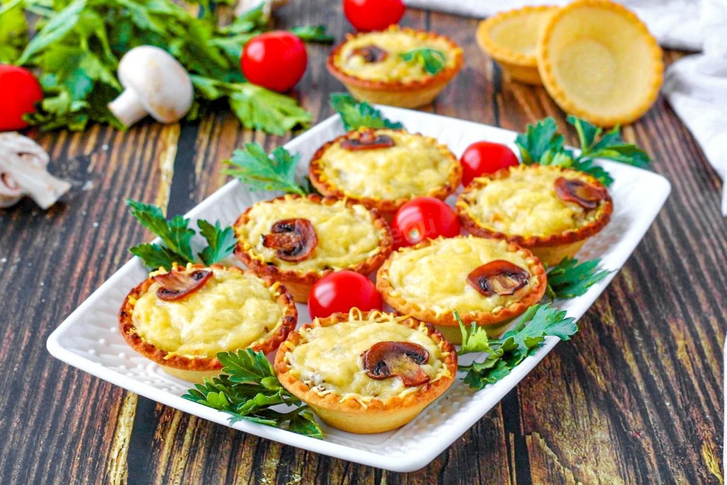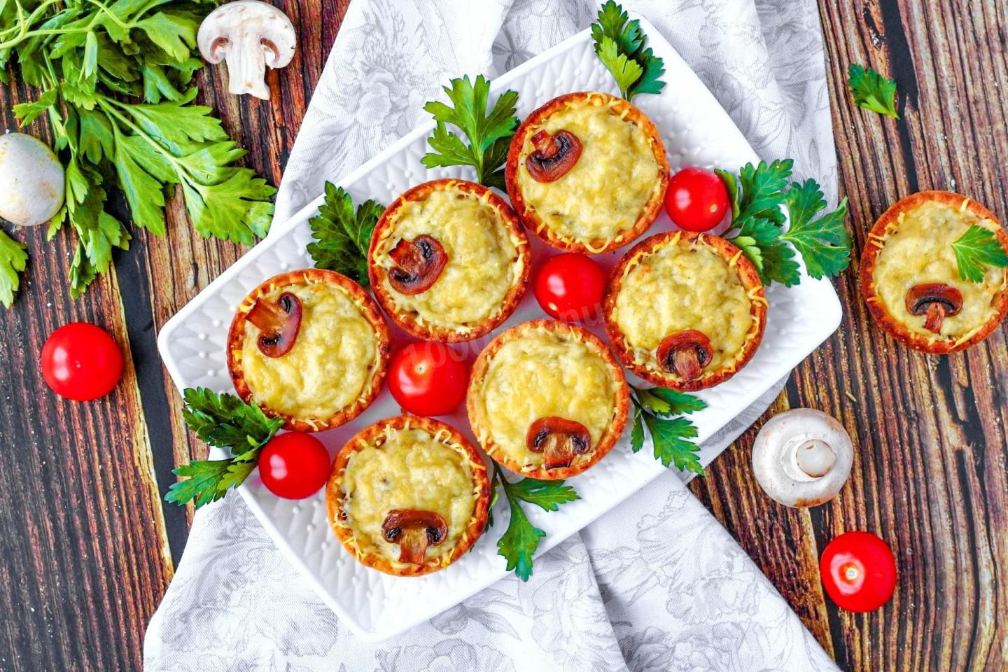 Сверху щедро присыпьте каждую тарталетку натертым сыром. Можно также украсить обжаренными пластинками шампиньонов.