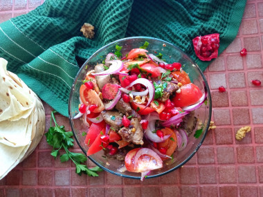 В удобной миске соедините все подготовленные продукты: остывшую печень, помидоры, лук, зелень, чеснок. Добавьте черный молотый перец, соль, грецкие орехи. Заправьте салат оливковым маслом, аккуратно перемешайте. Дайте салату постоять 10 минут.