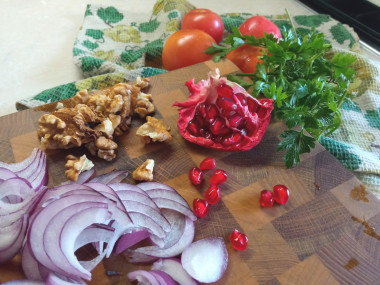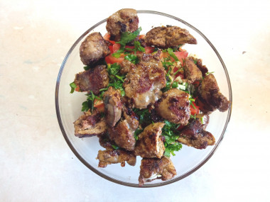 Как сделать салат с куриной печенью и помидорами по-грузински? Подготовьте необходимые продукты. Если куриная печень замороженная, разморозьте ее при комнатной температуре или в холодильнике. Зелень петрушки можно заменить на кинзу.