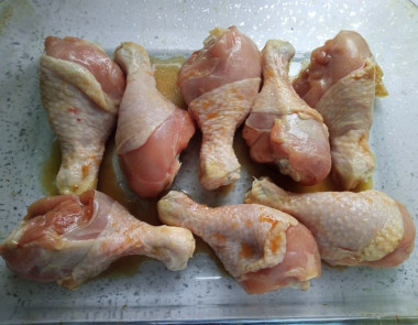 Куриные ножки хорошо промойте, осушите бумажным полотенцем и сложите в миску. Добавьте туда же мед, горчицу, масло и перец, посолите. Хорошо перемешайте, втирая смесь в курицу. Дайте немного постоять.