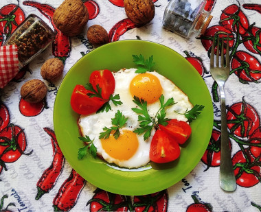 Переложите готовую яичницу на блюдо, украсьте половинками помидоров черри, ломтиками хлеба и веточками зелени. Приятного аппетита!