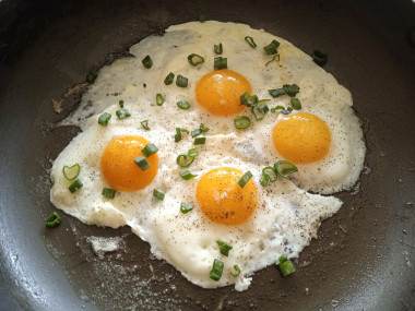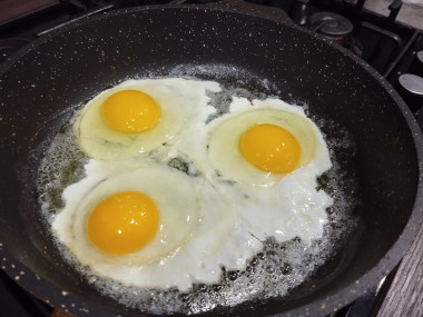 Жарьте яичницу на медленном огне без крышки около 5 минут. Белок должен схватиться, а желток остаться полужидким и ярким. Чтобы желток не затянулся белесой пленкой и сохранил полужидкую консистенцию, сковороду лучше не накрывайте крышкой. А если и накрываете, то не дольше 1-2 минут. При этом огонь нельзя добавлять, иначе яичница быстро поджарится и желток затвердеет.