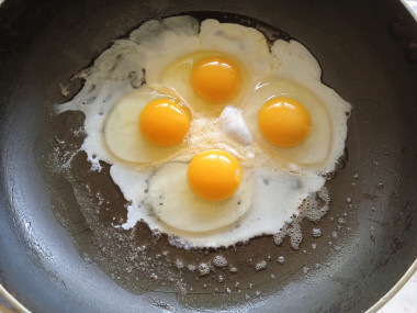 Вообще лучше не отходите от плиты, чтобы не пропустить момент, когда белки уже готовы, а желток еще жидкий. Солите яичницу в самом конце и только белковую часть, так как от соли на желтке появятся белые некрасивые пятна.