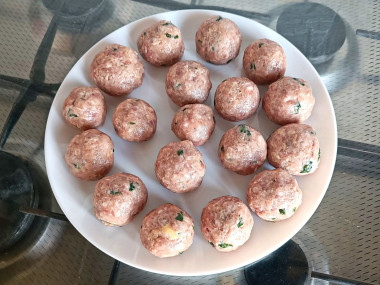 Сформировав фрикадельки, обжарила их на растительном масле (заменила им оливковое). Когда они хорошо зарумянились, налила в жаровню немного воды и закрыла крышкой. Оставила на маленьком огне на 10 минут.