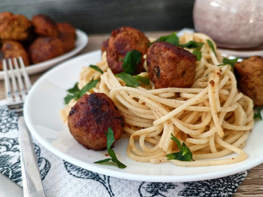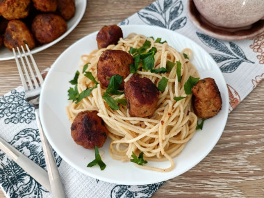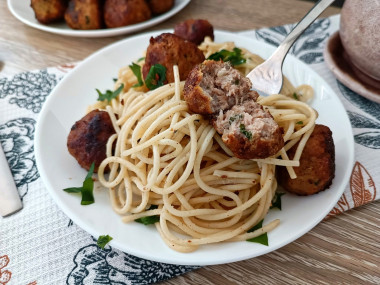 Затем сформировала фрикадельки, обжарила на среднем огне со всех сторон до золотистой корочки, затем убавила огонь на минимум, добавила немного воды и оставила тушиться под крышкой. Пока они тушились, успела отварить спагетти. Готовые макароны выложила в сковороду, перемешала и оставила на пару минут прогреться.