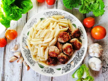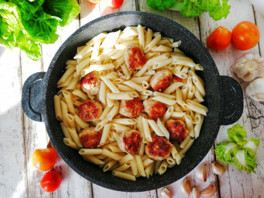 Получилось вкусное и сытное второе на обед! Фрикадельки мне понравились своей сочностью и ароматом, как и макароны, пропитанные мясным соком. Перья, сваренные до состояния альденте, хорошо дошли вместе с фрикадельками в жаровне, стали мягкие и аппетитные.