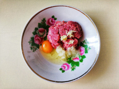 Начав готовить, в первую очередь занялась фаршем, он у меня был свиной. Соединила его с натертым на средней терке луком, яйцом и солью. Перец, сыр и зелень добавлять не стала. Чтобы внести пикантную нотку, добавила в фарш натертую дольку чеснока.