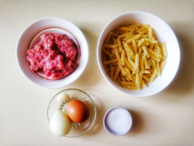 Как сделать вермишель с фрикадельками из мясного фарша? Подготовьте необходимые продукты. Фарш можно использовать любой: свиной, говяжий либо смешанный. У меня свинина и говядина. Оливковое масло можно заменить любым растительным без запаха. Альтернативой пармезану может быть любой твердый сыр. Вермишель можно заменить любыми макаронами. Я в этот раз взяла спагетти из твердых сортов пшеницы.