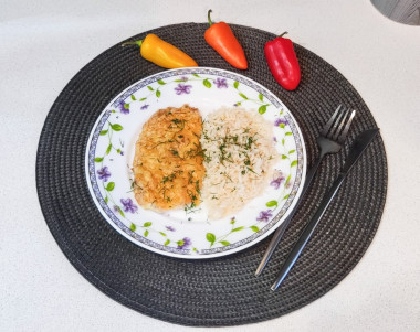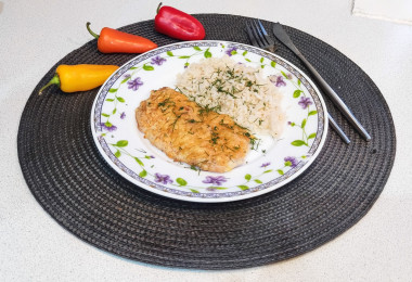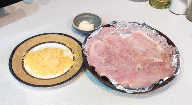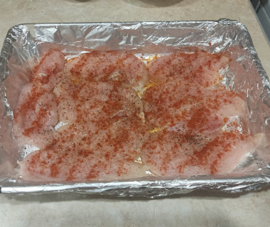 Я воспользовалась калькулятором на сайте, чтобы уменьшить количество ингредиентов. По моему опыту, когда филе не до конца разморожено, его чуть легче разрезать на тонкие ровные пласты. За способ отбивания мяса через пакет отдельное спасибо - ничего не разлетается по сторонам, не нужно потом отмывать половину кухни) Чеснок не стала добавлять, так как домашние не любят его. Форму для запекания предварительно выложила фольгой, а затем смазала маслом.