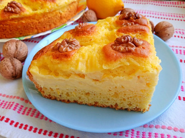 Пирог с лимонным заварным кремом мне очень понравился и не только мне) Я его пекла на день рождения, пирог пришелся по вкусу и взрослым и детям. Очень интересное сочетание коржа и крема, получается практически торт) Мякиш очень пористый, сочный, мягкий. Крем просто восхитителен, вообще люблю заварной крем, а по этому рецепту он получился не только нежным и вкусным, но ещё и супер ароматным. Цедра сначала показалась мне жестковатой, но после выпечки она размягчилась и стала очень приятной на вкус. Крем я вносила в тесто при помощи большой насадки "открытая звезда", старалась поглубже его вдавить. Для меня это был новый опыт) Замечу, что крема получилось много, это меня очень порадовало. После выпечки крем сверху немного схватился, но остался таким же нежным. Миндальных лепестков не было, выложила в промежутках половинки грецких орехов. Думаю замена прошла хорошо, орешки поджарились, стали хрустящими, ароматными. Все отлично сочетается. Теперь хочу попробовать сделать с апельсином. Пирог очень вкусный! Всем настоятельно рекомендую!