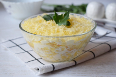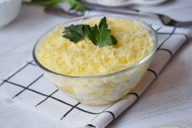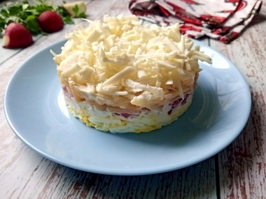 Уложите сыр третьим слоем, утрамбуйте его. Аккуратно смажьте сыр сверху майонезом. Уберите салат для пропитки в холодильник. Затем снимите кольцо и украсьте по вкусу. Я натерла сверху оставленный желток.
