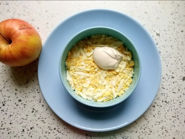 Выложите натертое яблоко следующим слоем. Смажьте его также майонезом.