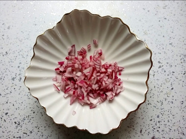Первым делом подготовьте лук. Чтобы убрать из него горечь, замаринуйте его. Для этого очистите и нарежьте луковицу на мелкие кубики. Затем залейте их столовым уксусом и оставьте постоять на 10 минут. Этого времени будет достаточно, чтобы вкус лука стал мягче. Через положенное время откиньте лук на сито и промойте под проточной водой.