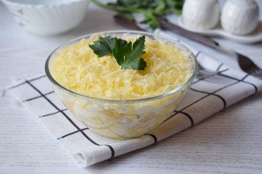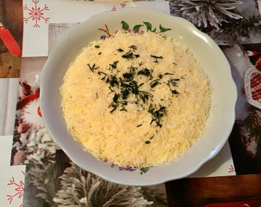 Яйца очистите от скорлупы и натрите на крупной терке. Я готовила из расчета 5 яиц, один желток отложила для украшения верха салата.