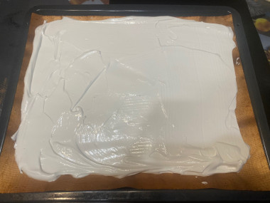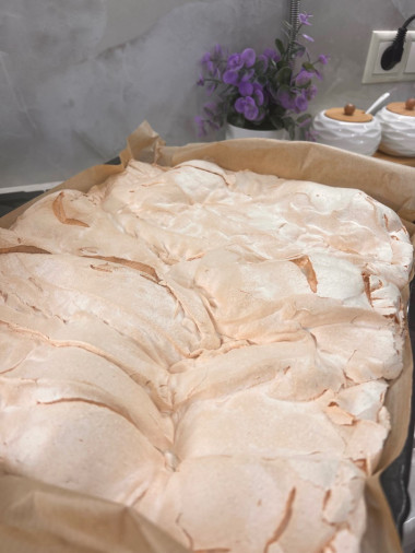 Меренга должна стать слегка золотистого цвета. Извлеките противень из духовки. Накройте меренгу еще одним листом пергамента.
