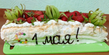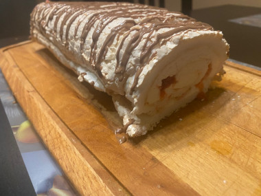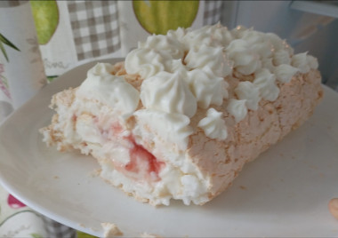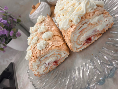Я готовила меренговый рулет второй раз в жизни. В прошлый раз получилось неудачно, потому что у меня не взбились сливки и не скрутился рулет, и в этот раз я тревожилась перед приготовлением. Но сегодня сложностей не возникло :) для крема использовала творожный сыр, сахар и джем клубничный. Это мой подарок маме на день рождения, надеюсь, ей понравится! Спасибо за рецепт