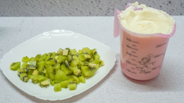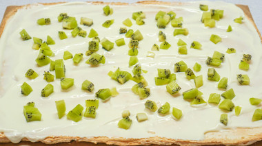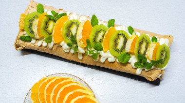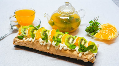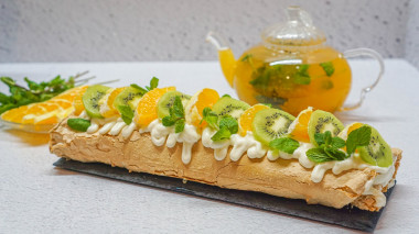 Подготовила ингредиенты, взбила белки с пудрой до глянца. Меренгу выложила на силиконизированный коврик для выпечки, поставила выпекаться. За это врем взбила крем из жирных сливок и творожного сыра. Вместо конфитюра использовала свежие фрукты - киви, очистила и нарезала кубиками. Меренгу остудила, нанесла крем и нарезанные киви, свернула в рулет. Готовый десерт украсила кусочками киви, дольками апельсина и свежими листьями мяты. Десерт получился вкусным и аппетитным!