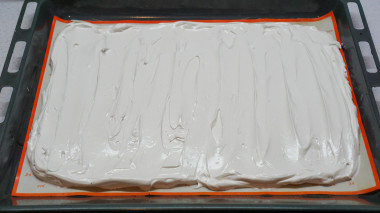 Противень для выпечки (40*40 см) застелите кулинарной бумагой и выложите всю взбитую меренгу. Подробнее о выборе пергамента читайте в отдельной статье по ссылке в конце рецепта.