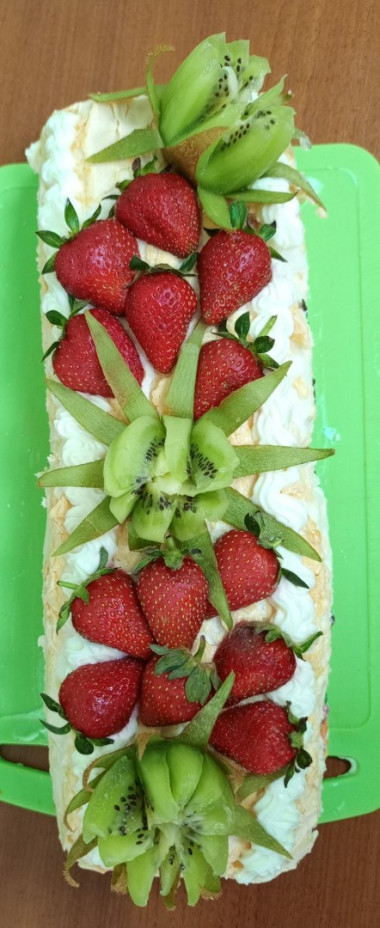 Сверху рулет можно украсить любыми ягодами или фруктами. Готовый рулет уберите в холодильник, чтобы крем немного застыл.