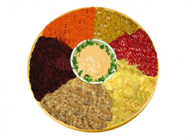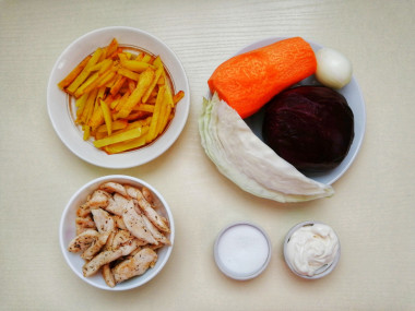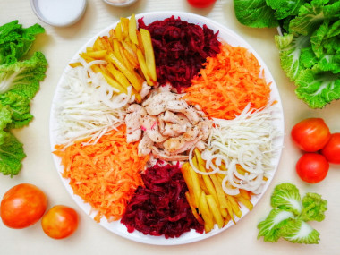 Свеклу решила сварить, так как муж не ест свежую. Свеклу и морковь натерла на крупной терке, капусту и лук тонко нарезала. Все ингредиенты выложила на большую тарелку. Мясо в середину, овощи вокруг него.  Выглядело всё очень ярко и аппетитно! Положила себе на тарелку мясо и овощи - всего понемногу, заправила майонезом. Ммм...  Вкусно! Сочетание свежих овощей с мясом и жареной  картошечкой - замечательное! Особенно пришлись по вкусу свежие овощи - сочные и хрустящие.