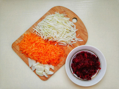 Свёклу помойте и отварите до готовности (в большинстве рецептов предлагается такой вариант). Мне больше салат нравится с сырой свёклой, в рецепте я использовала именно её. Вы выберите для себя какой вариант вам более по вкусу. Морковь очистите, с капусты удалите внешние жёсткие листы, огурец и всё остальное ополосните.