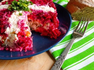 У меня есть три любимых салата: оливье, селёдка под шубой и салат Цезарь. Теперь у меня появился четвёртый любимчик: салат со свёклой, курицей и солёным огурцом.