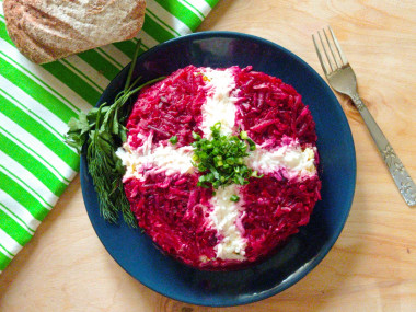 Праздничный салат со свёклой готов! Перед подачей выложите веточки укропа по окружности салата, сверху украсьте по желанию. Поставьте салат на 1 час в холодильник, чтобы пропитался. Приятного аппетита!