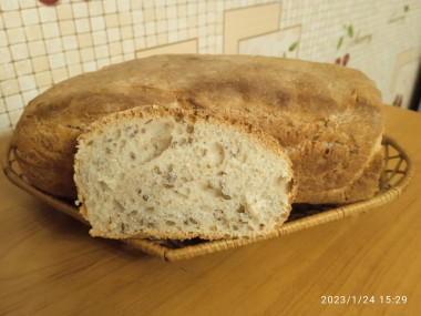Не знаю, получится ли хлеб таким же красивым как у автора, если его обсыпать магазинными, а не домашними панировочными сухарями. Я решила в этот раз обойтись без них, в остальном же следовала рецепту. Благодаря длительной расстойке мякиш мягкий, пористый, что хорошо видно на разрезе. Так же там можно увидеть семена льна, которые я добавила для большей полезности хлеба. Спасибо, Сибирячка, за рецепт.