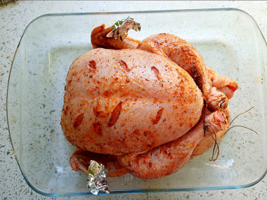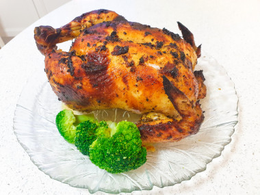 Великолепная Курица с хрустящей корочкой запеченная в духовке целиком получилась! Очень мне захотелось запеченную курицу на ужин, именно целиком. Птичку замариновала за сутки, все это время периодически переворачивала тушку на разные стороны. Для маринада взяла все по рецепту, кроме карри. Эта приправа закончилась, поэтому добавила смесь для курицы. Смесь перцев взяла из мельнички, так специи получаются более ароматными. Мне очень нравится добавлять растительное масло, оно обволакивает мясо, которое равномерно запекается, образуя румяную корочку. Ну, а мёд это вообще классика! Благодаря ему маринад хорошо держится на курице, а при запекании получается хрустящая красивая корочка со сладковатым привкусом. Перед маринованием я сделала несколько глубоких проколов ножом в грудке, чтобы соус получше пропитал толстый слой мяса. Курица у меня была весом чуть больше двух кг., я ее запекала 1,5 часа. Курочка получилась просто шикарная! Она румяная, нежная, аромат великолепный! Спасибо за рецепт! Очень рекомендую)