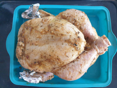 Обмажьте курицу медово-масляной смесью со всех сторон и внутри тушки. Оставьте птичку мариноваться при комнатной температуре на 1 час. Если есть возможность, то лучше оставьте в холодильнике на ночь.