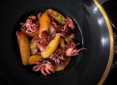 Как только появится вкусный чесночный аромат, выложите в сковороду к ароматному чесночному маслу отварные осьминожки, обжаренный картофель, свои любимые специи и соль. Перемешайте и немного обжарьте на небольшом огне, чтобы продукты пропитались чесночным ароматом и специями.