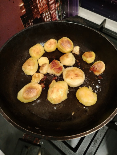 В сковороду налейте растительное масло и дайте ему разогреться. На среднем огне обжарьте мини картофель до образования красивой румяной корочки. Обжаренный картофель переложите в мисочку.