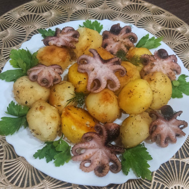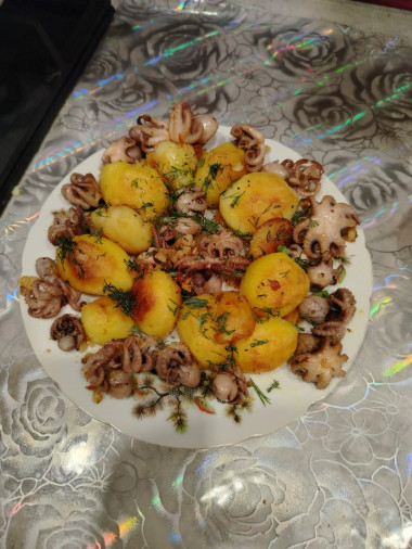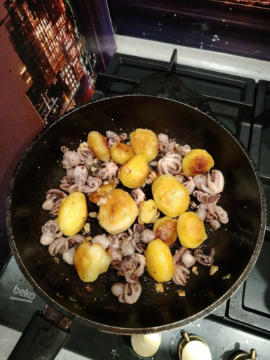 Заинтересовал рецепт -осьминоги маленькие замороженные на сковороде с картошкой. И так как я ни разу не пробовала осьминогов, решила приготовить. Осьминожков разморозила так ,как советует автор. Картофель брала не молодой,но выбирала помельче. Сначала отварила картофель и осьминожков. Обжарила измельченный чеснок и затем добавила картофель, осьминогов,соль и специи. Аромат был потрясающий!