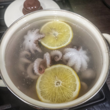 В кастрюлю налейте воду, добавьте 2-3 кружочка лимона и поставьте кастрюлю на огонь. Когда вода закипит, аккуратно опустите в кипящую воду очищенные осьминожки. Под действием кипятка щупальца осьминожек тут же начнут сворачиваться. Образующуюся пенку снимите с помощью шумовки. Варите осьминожков на среднем огне примерно 10 минут. Обратите внимание, что при варке, воду солить не нужно, так как соль мешает равномерно провариться осьминожкам.