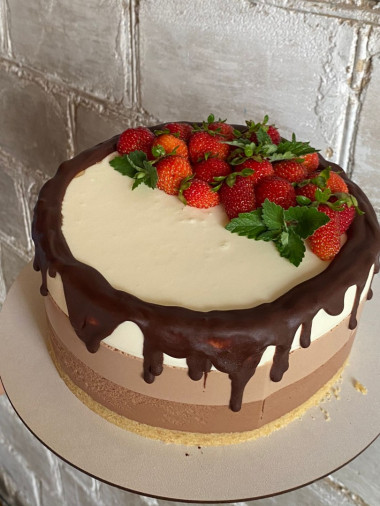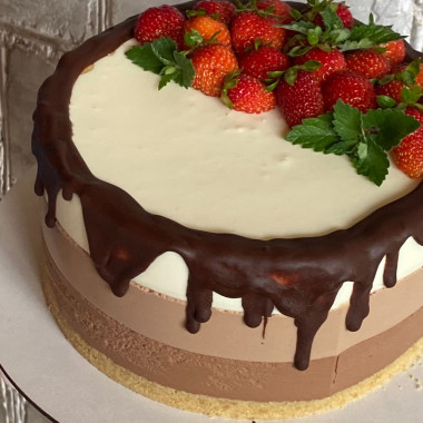 Отзыв 1: Красивый, высокий, трехцветный чизкейк! Подтеки из шоколадной глазури придают ему аппетитный вид, а украшение из оранжевых апельсиновых цукатов делает его ярким и привлекающим внимание.