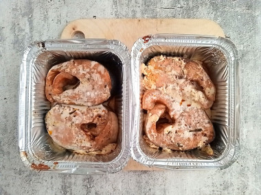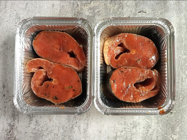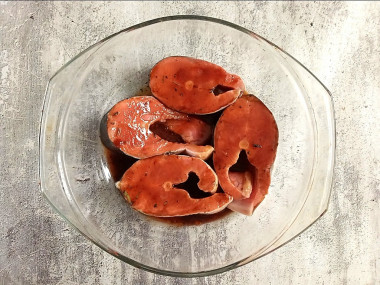 Емкость со стейками прикройте крышкой и оставьте мариноваться на 0,5-1 час. Чем дольше маринуется рыба, тем в итоге вкуснее получится. За время маринования переверните стейки пару раз, чтобы они мариновались более равномерно со всех сторон. Если время маринования будет значительно увеличено, тогда лучше поместить емкость со стейками в холодильник.