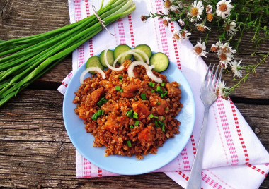 Гречка со свининой готова! Дополните блюдо свежими овощами. Приятного аппетита!